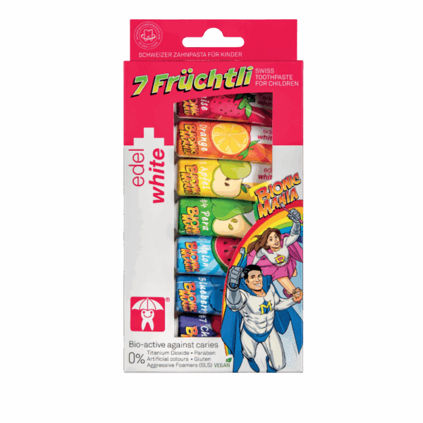 Die 7 Früchtli Kinderzahnpasta von edel+white ist als einzige Kinderzahnpasta von Aktion Zahnfreundlich zertifiziert.
